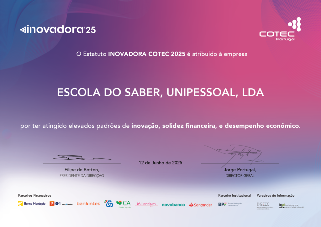 É com enorme satisfação que partilhamos que a Escola do Saber, foi distinguida com o Estatuto INOVADORA COTEC 2025, um reconhecimento que reforça o nosso compromisso com a inovação, a excelência e a sustentabilidade empresarial.